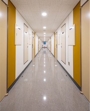천정형 개별 냉방시스템 도입(최신 공기정화시스템 포함) / 건강 온돌난방 포함 샤워실 및 화장실 구분, 인터넷 / 통합 출입통제 시스템(CARD KEY)